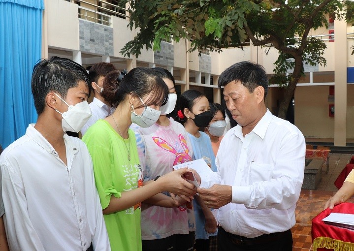 Ông Dương Minh Tú, Giám đốc Công ty TNHH MTV Xổ số Kiến thiết tỉnh Bà Rịa - Vũng Tàu trao học bổng tới các em HS.