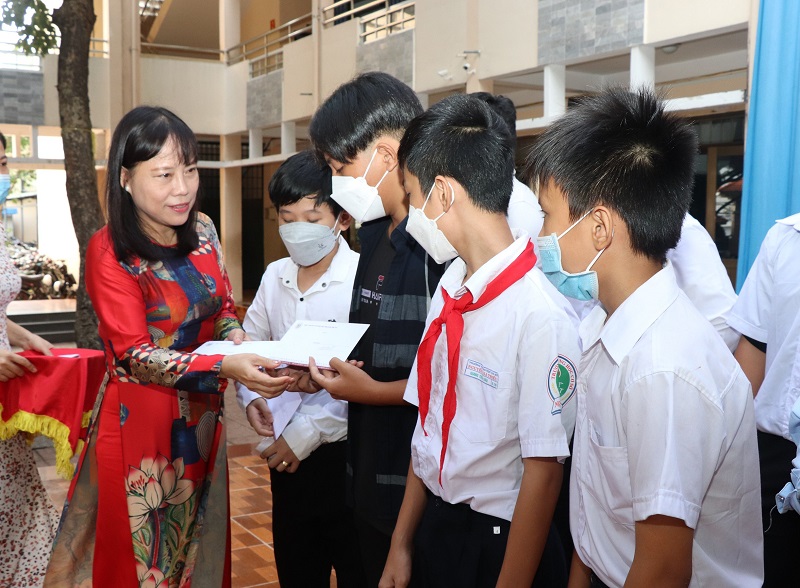 Bà Đỗ Nguyễn Hoàng Dung, Q. Tổng Biên tập Báo Bà Rịa - Vũng Tàu trao học bổng cho các em HS.