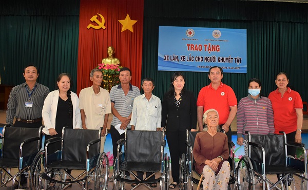 Sáng 1/12, Hội Chữ thập đỏ (CTĐ) tỉnh phối hợp với Công ty TNHH MTV Xổ số kiến thiết tỉnh, Hội CTĐ huyện Đất Đỏ tổ chức trao tặng 12 xe lăn, xe lắc cho người khuyết tật (ảnh) có hoàn cảnh khó khăn trên địa bàn xã Lộc An và TT. Đất Đỏ.