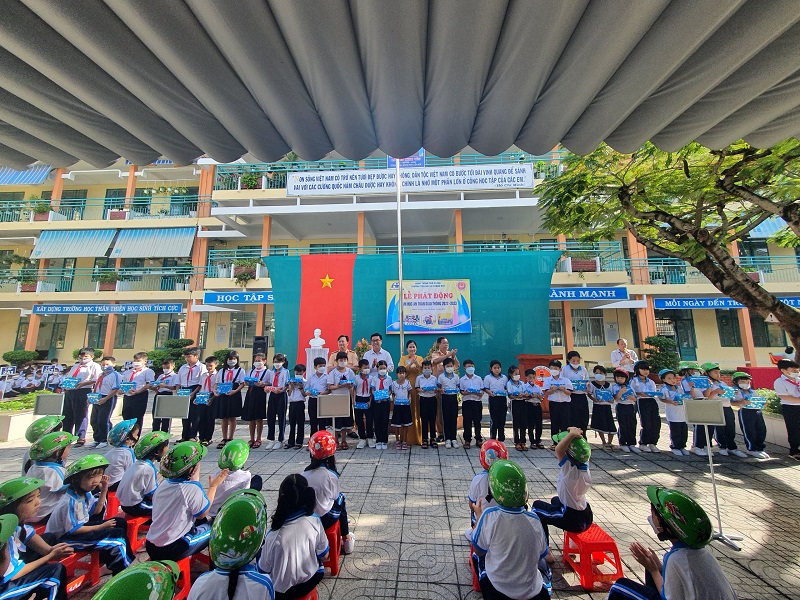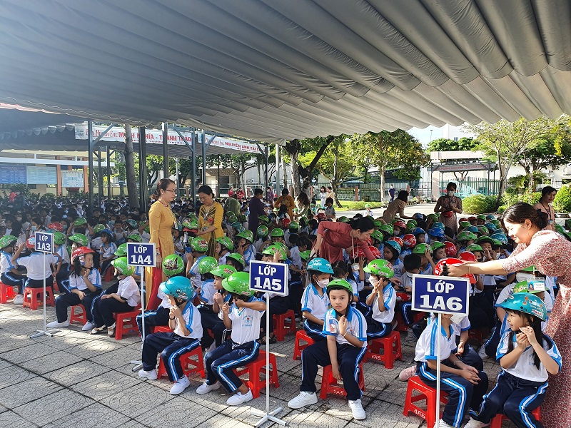 trao nón bảo hiểm và tập vở cho các em học sinh Trường TH Lê Thành Duy