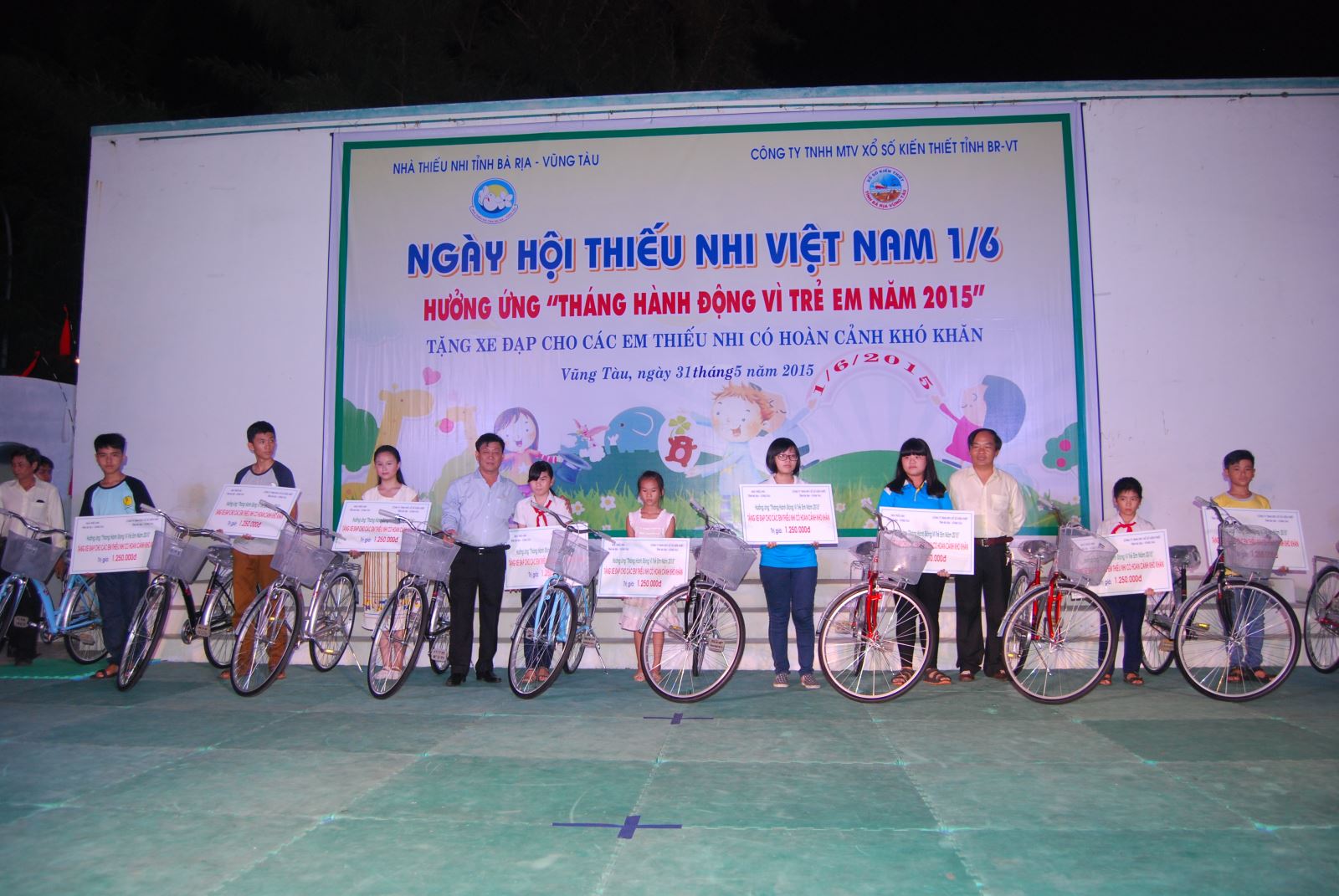 Tối ngày 31/05/2015 tại sân khấu ngoài trời Nhà thiếu nhi tỉnh bà Rịa – Vũng Tàu diễn ra Ngày hội thiếu nhi Việt Nam 01/6; Hưởng ứng “Tháng hành động vì trẻ em năm 2015”. Trong chương trình, Công ty TNHH MTV Xổ số kiến thiết tỉnh bà Rịa – Vũng Tàu đã tài trợ 50 chiếc xe đạp cho các em thiếu nhi có hoàn cảnh khó khăn.