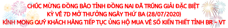 * Kỳ vé 7D mở thưởng ngày thứ Ba (28/07/2020) của Công ty TNHH MTV Xổ số kiến thiết tỉnh Bà Rịa – Vũng Tàu phát hành: Khách hàng Tỉnh Đồng Nai đã trúng Giải đặc biệt.