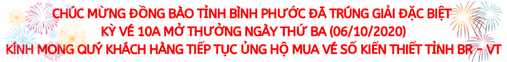 * Kỳ vé 10A mở thưởng ngày thứ Ba (06/10/2020) của Công ty TNHH MTV Xổ số kiến thiết tỉnh Bà Rịa – Vũng Tàu phát hành: Khách hàng Tỉnh Bình Phước đã trúng Giải đặc biệt.