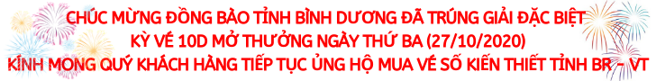 * Kỳ vé 10D mở thưởng ngày thứ Ba (27/10/2020) của Công ty TNHH MTV Xổ số kiến thiết tỉnh Bà Rịa – Vũng Tàu phát hành: Khách hàng Tỉnh Bình Dương đã trúng Giải đặc biệt.